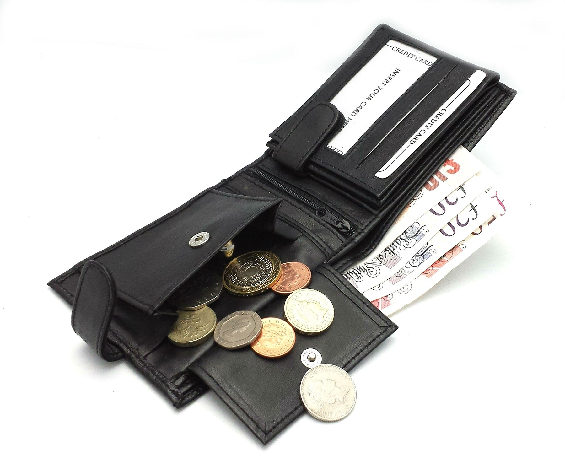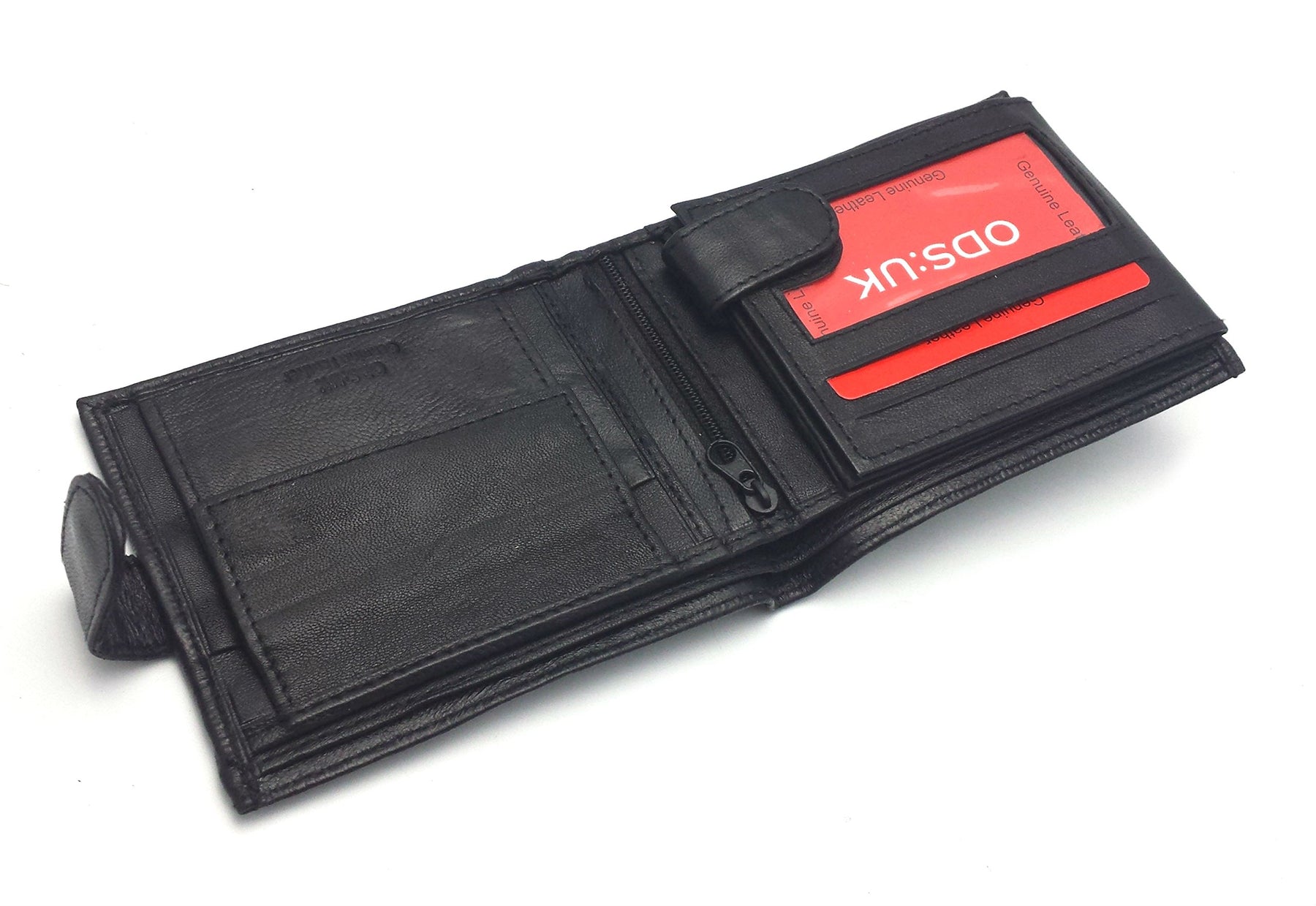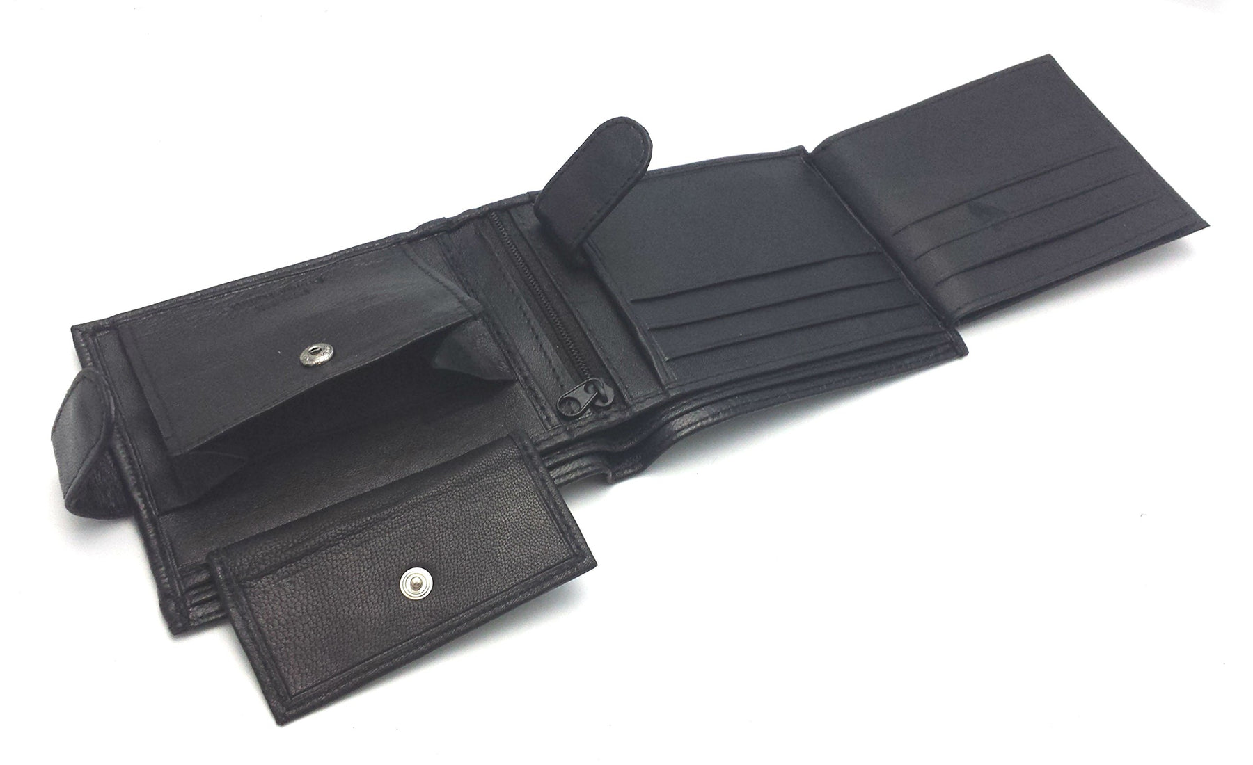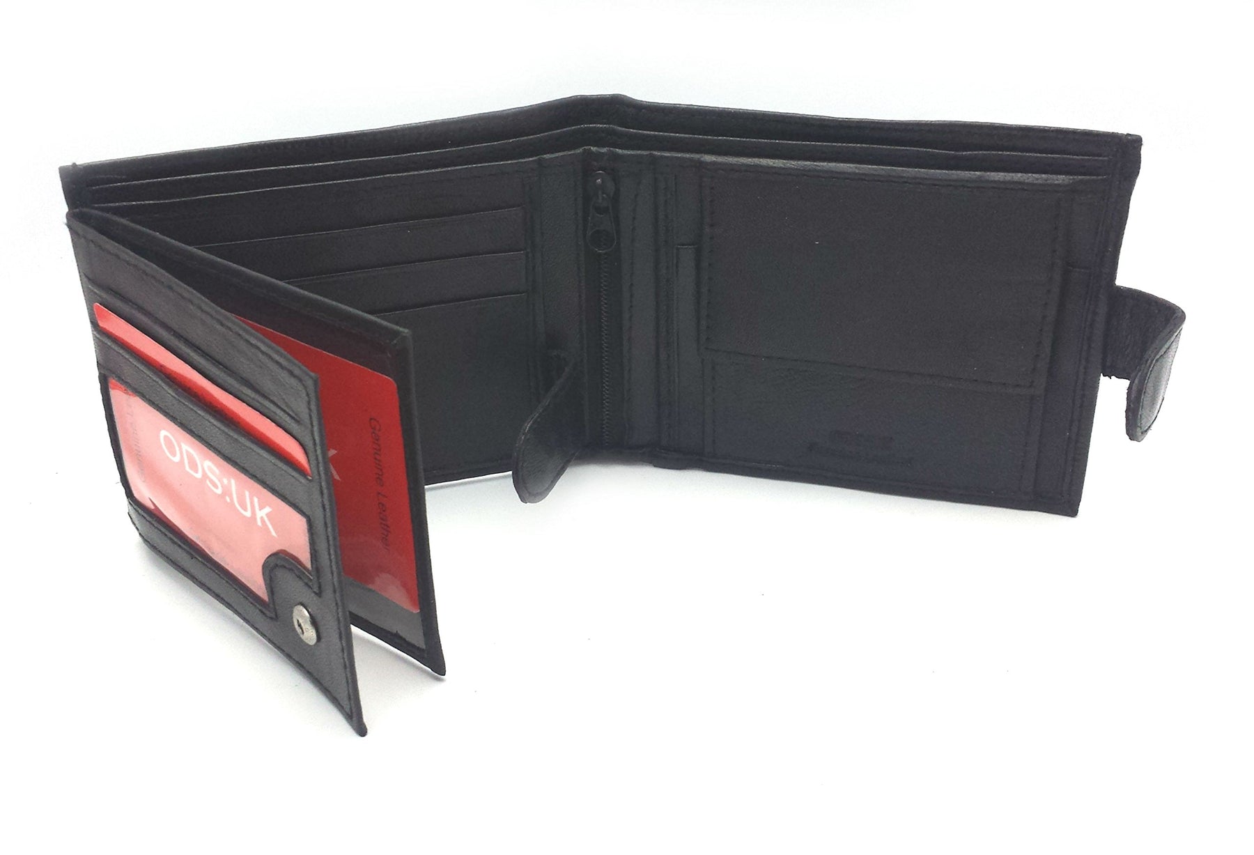 Details: Description Bi- fold design Loop and Popper opening 11 Pouches for debit or credit cards 3 Clear pouches for ID / Driving licence 2 compartments for notes 1 zipped compartment for Receipts/ Notes 1 change pouch with press stud closing Size 115mm x 90mm approx
